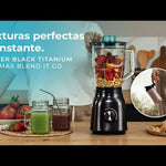 1800ვტ-იანი კარას ბლენდერი უჟანგავი ფოლადის საფარით, 6 შავი ტიტანის საფარიანი პირითა და 1.5 ლიტრიანი მინის ჭურჭელით.