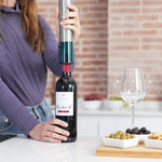 ელექტრული ღვინის გასახსნელი, 2 წვეთოვანი ჩასასხმელი, ჰერმეტული საცობი, ბოთლის ეტიკეტის საჭრელი, 4 AA ბატარეა