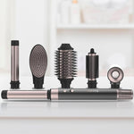 Includes 6 ceramic coated heads for a variety of hairstyles: hair dryer, 32mm brush, 60mm brush, straightening brush, and 2 curling cylinders (right and left).