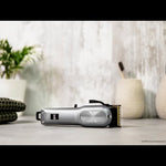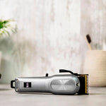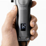 Professional hair clipper with lithium battery, stainless-steel blades, and precision settings.