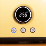 Toaster with digital display and 2 short slots for 2 slices of toast.