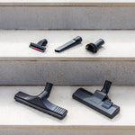 Variedad de accesorios que permiten una perfecta limpieza en todo tipo de superficies. Incluye: accesorio para rincones, accesorio para mueble, accesorio para telas, base de aspiración de húmedos y base de aspiración.