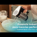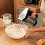 ხელის მიქსერი, 500 ვტ, 5 სიჩქარის დონე და Turbo ფუნქცია, 3 უჟანგავი ფოლადის აქსესუარი.
